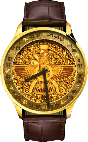 Montre de collection homme avec un double cadran en or qui reprendra sur sa partie supérieure des symboles de la perse ancienne. Sa partie inférieure, pièce maitresse de la montre, détaillera Ahura Mazda, dieu et Seigneur Sage de l'ancien Iran.